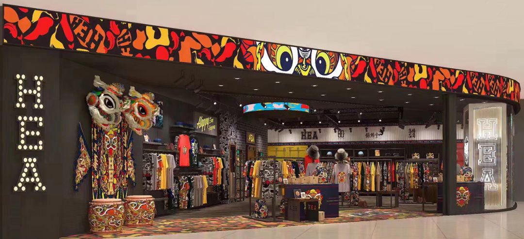 HEA的龙狮文化不仅体现在衣物设计上,其在佛山还建有龙狮文创馆,收藏展出数百款不同的造型、不同风格的精品狮头。此外,还有集合HEA众多周边产品的HEA生活馆和龙狮客栈,作为其周边文创产品的补充,通过不同形式、不同主题的业态全方位展示龙狮文化。